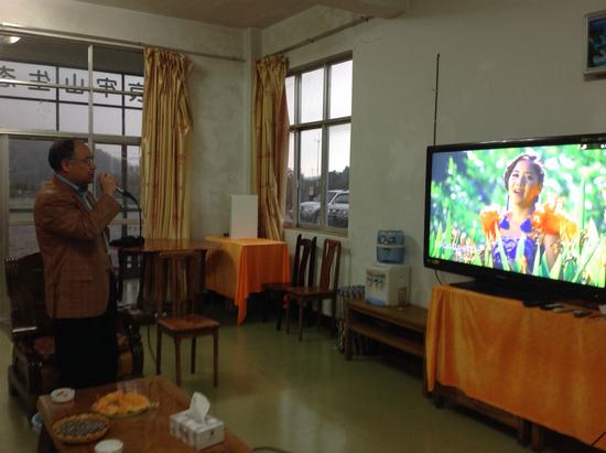 哀牢山生态站常务副站长刘玉洪将版纳植物园园歌《家园》光碟和《美景无量》画册等送客人们。