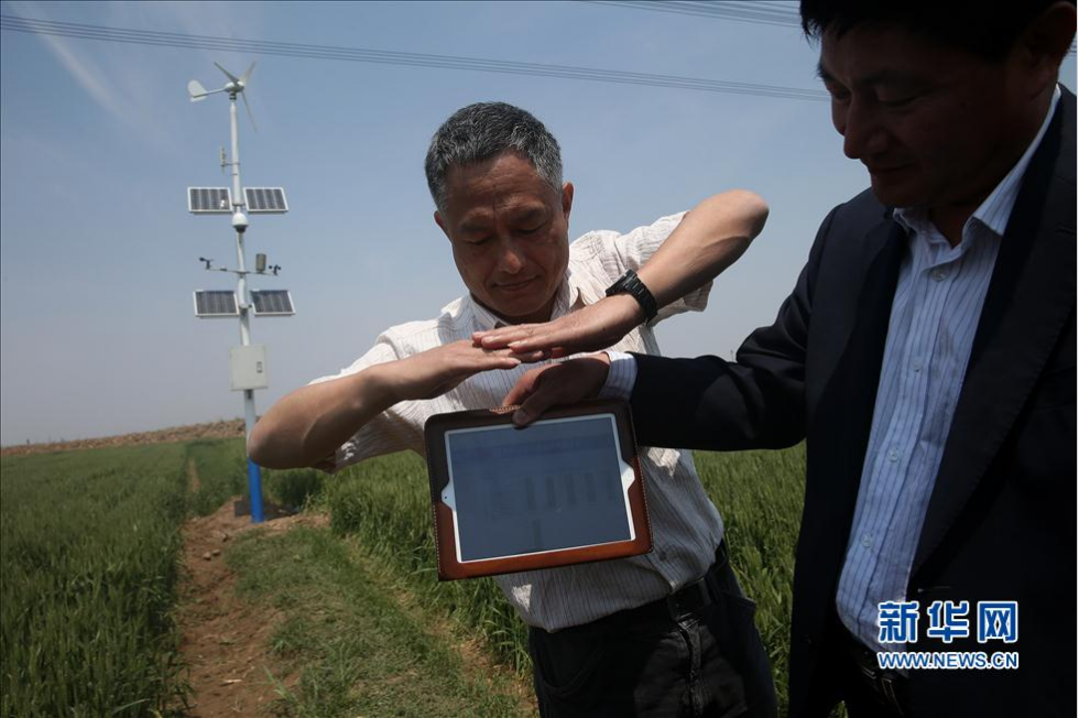 5月8日,科研人员在山东省无棣县万亩试验示范基地向记者展示“智慧稻草人”农业物联网平台上的数据。他们身后立着的就是“智慧稻草人”,这台自动化数据收集系统可以采集湿度、盐度等土壤信息,并自动发送至物联网平台,方便科研人员开展研究。
