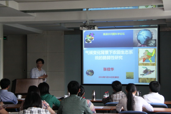 张佳华研究员做了题为“气候变化条件下农田生态系统的脆弱性研究”。报告详细介绍了他主持的全球变化重大专项课题在全国不同气候类型区的农田生态试验站开展的OTC-CO2与降水模拟控制试验以及我国主要作物大田红外增温试验。