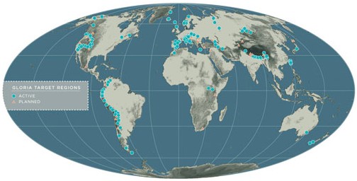 “全球高山生态环境观测研究计划”(Global Observation Research Initiative in Alpine Environments, GLORIA)是针对气候变化对山地生态环境影响的监测评估问题而建立的一个国际性的研究网络,其主要任务就是要在地球上主要山地系统采用标准化监测方案来建立一个国际性的长期观测研究网络,获取全球高山生物多样性和植被格局的标准化数据,从而评估气候变化下高山生态系统的生物多样性丧失及其脆弱性。截至目前,GLORIA已在全球117个高山地区建立了长期观测样地,在中国包括贡嘎山在内有5个。