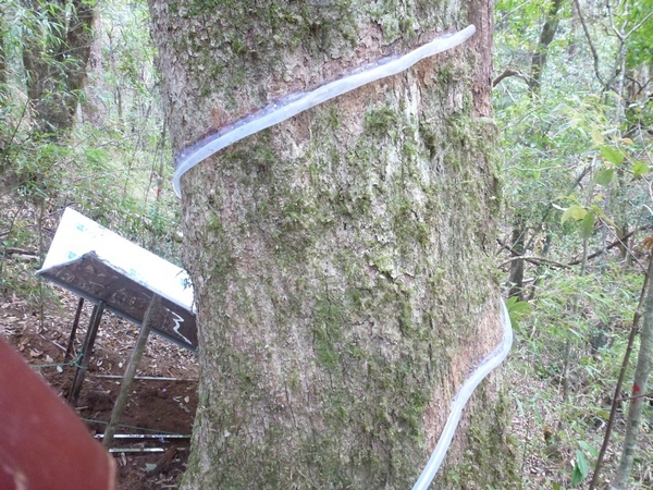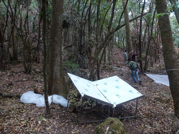 由地化所冯新斌研究员主持的国家自然科学基金重点项目—“亚热带与温带森林小流域生态系统汞的生物地球化学循环及同位素分馏(41430754)”于2015年正式启动。项目组成员此次到哀牢山是为采样布置监测设施——雨水样品采集的相关设备。通过工作,在需要监测的小流域内的所选定优势树种附近放置了穿透雨采样板,采样板呈“V”字形近平角放置,同时在林外空旷地作为对照,放置了相同的采样板采集空旷地降水;并在林内3种优势树种树干上设置了不吸附汞的Teflon材质制作的树干径流收集装置;同时在选定的小流域中设置了地表径流测定点,设置了V堰实时监控河流的水位及水量变化情况。这些设施将为该流域内物质循环的质量平衡提供重要数据支持,预计于5月雨季正式开始采样观测。