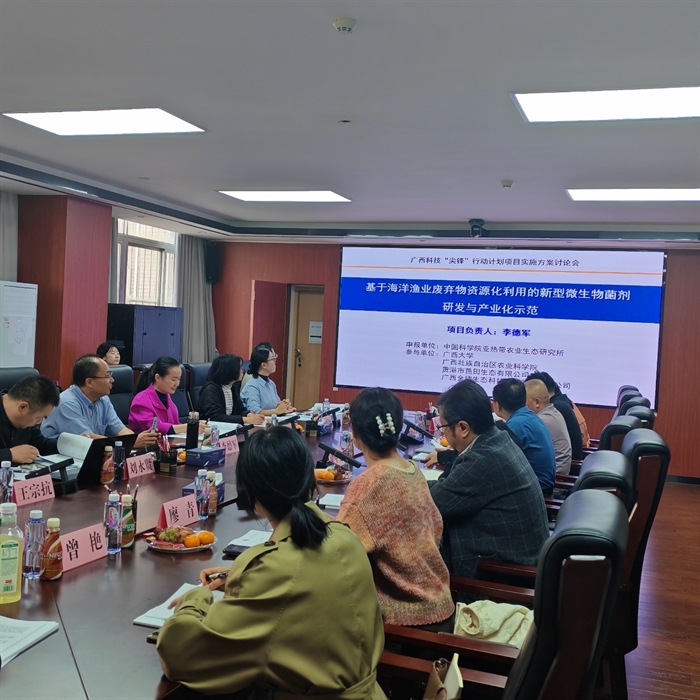 12月9日,广西“尖锋”行动计划项目“基于海洋渔业废弃物资源化利用的新型微生物菌剂研发与产业化示范”实施方案研讨会在南宁召开。项目负责人、中国科学院亚热带农业生态研究所环江喀斯特生态系统观测研究站李德军研究员,课题负责人和科研骨干等20余人参加会议。会议由广西农业科学院农业资源与环境研究所副所长刘永贤研究员主持。