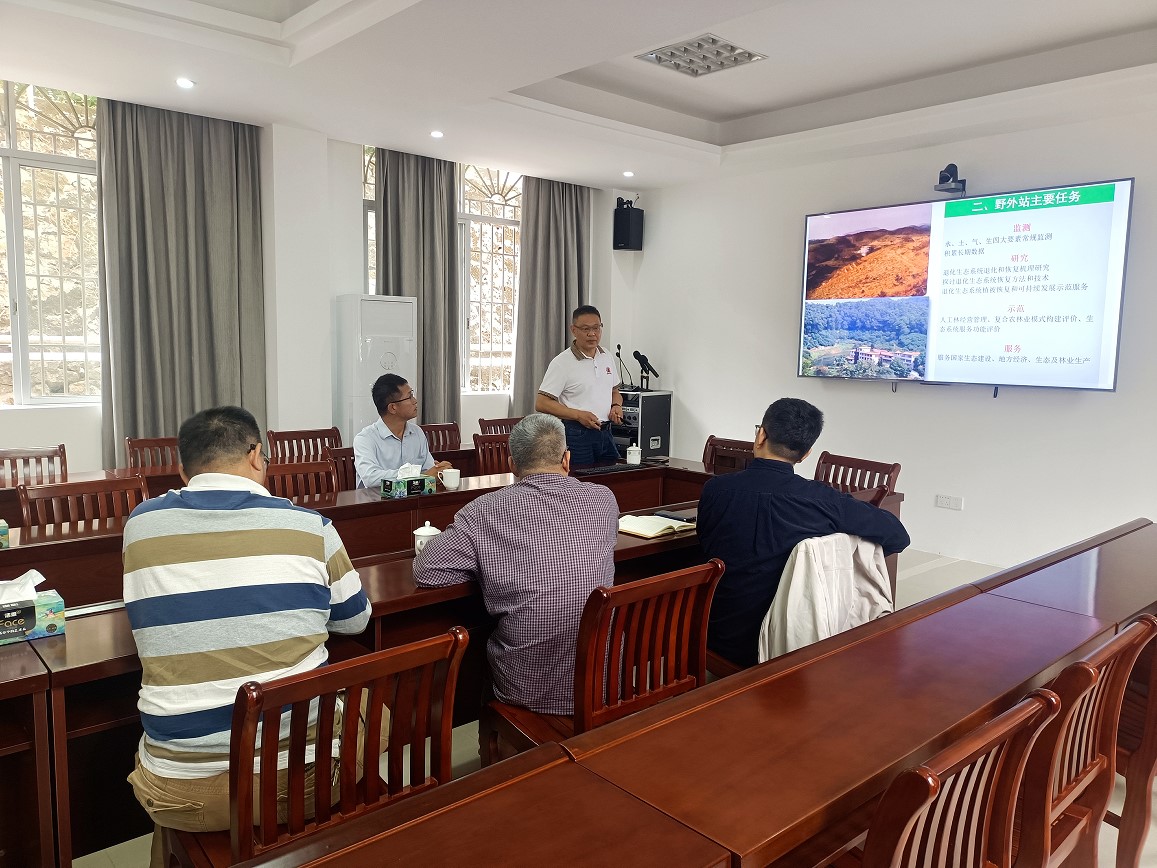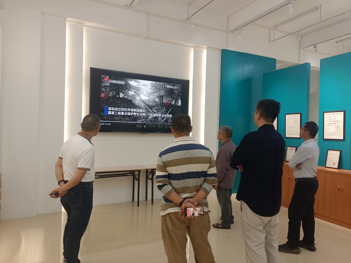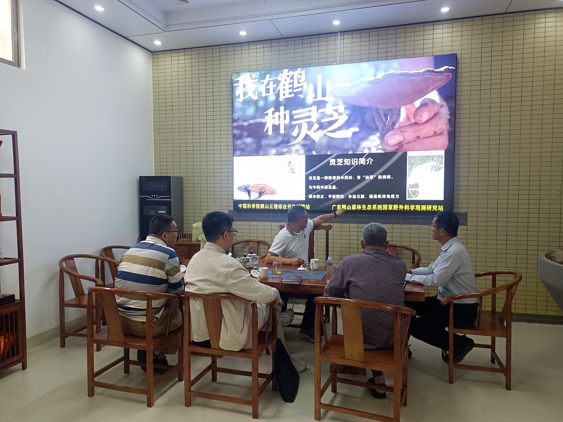 鹤山站副站长林永标、鹤山市林科所所长郭志锋热情接待考察组一行,详细介绍了鹤山站的发展历程、核心任务、科研成果及在服务地方科技进步、推动林业可持续发展中的实践成效。调研期间,考察组集中观看了鹤山站40周年发展宣传片,以及记录站点发现国家二级保护动物豹猫、林下灵芝培育等特色工作的专题影片,直观感受站点的科研实力与生态价值。