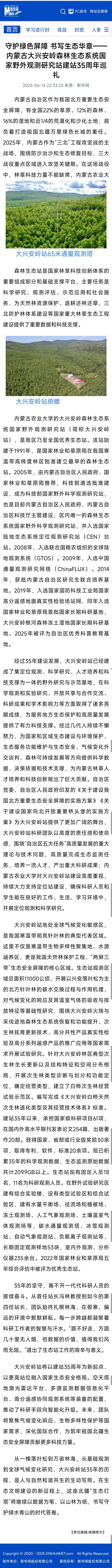 2025 年 6 月 14 日,新华社发布《守护绿色屏障 书写生态华章 —— 内蒙古大兴安岭森林生态系统国家野外观测研究站建站 35 周年巡礼》,全面回顾我站 35 载生态观测研究历程与成果。