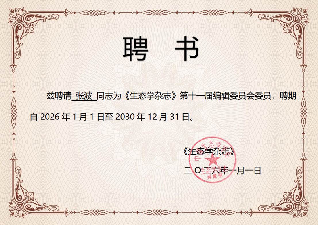 近日,经严格筛选与评审,中国科学院新疆生态与地理研究所新疆策勒荒漠草地生态系统国家野外科学观测研究站(简称策勒站)张波副研究员,获聘为《生态学杂志》第十一届编辑委员会委员,聘期自2026年1月1日至2030年12月31日。此次聘任是对张波副研究员在生态学领域,尤其是干旱区地理生态研究方面所取得学术成就的充分肯定,也体现了策勒站在荒漠生态学研究方向的学术影响力获得国内同行的广泛认可。