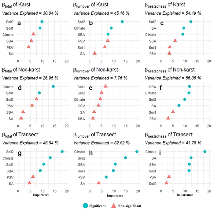研究表明,喀斯特与非喀斯特森林在物种组成上存在显著差异。当将两类森林同时纳入分析时,整条样带的βtotal和βturnover显著高于任何单一岩性森林,而βnestedness则显著降低,表明岩性差异显著增强了群落间的物种组成异质性。研究还表明,西南喀斯特地区β多样性的纬度格局并非由单一过程驱动,而是喀斯特与非喀斯特两个森林子系统动态叠加的结果。整条样带的βtotal和βturnover随纬度升高而显著下降,这一趋势主要由喀斯特森林所主导,并与岩溶作用密切相关的土壤理化性质异质性变化密切相关。相比之下,βnestedness随纬度升高显著增加,则主要反映了非喀斯特森林中由气候因子增强所引起的环境筛选作用,表明不同岩性森林对纬度变化的响应机制存在明显差异。总的来说,这项工作从地质-土壤-植物耦合视角揭示了地质背景在塑造大尺度植物多样性空间格局中的关键作用,不仅拓展了对β多样性维持机制的理解,也为区域植物多样性保护提供了新思路。